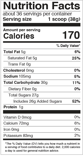 Sugar, Creamer [Coconut Oil, Corn Syrup Solids, SodiumCaseinate (a Milk Derivative), Sugar, Tricalcium Phosphate, Dipotassium Phosphate, Propylene Glycol Esters of Fatty Acids, Mono- and Diglycerides, Salt, Artificial Flavor], Whey Protein Concentrate, Natural and Artificial Flavor, Salt,Artificial Color (Yellow 5 Lake, Blue 1 Lake).